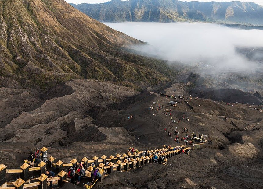 Between these peaks lies the Tengger Sand Sea, a vast expanse of volcanic ash that creates a stark, surreal desert landscape unique in Indonesia. This area is sacred to the Tenggerese people, a Hindu community believed to be descendants of the Majapahit Empire. Their annual Yadnya Kasada ceremony, in which offerings are cast into Mount Bromo’s crater, is a powerful expression of devotion and cultural continuity.