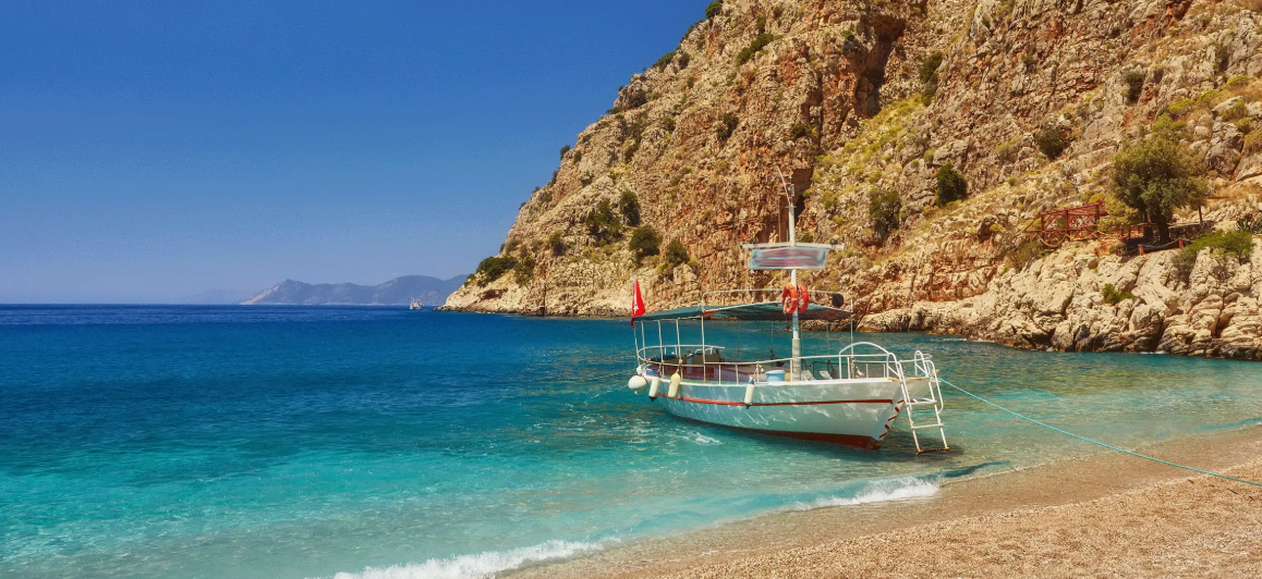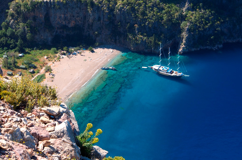 Butterfly Valley, near Faralya in Turkey, is a stunning and secluded natural area only accessible by boat or a steep hiking path from the village. The valley features sheer cliffs over 300 meters high, a pebble beach, a waterfall that flows year-round, and a rich habitat for about 100 butterfly species, including the endemic Jersey Tiger butterfly.
