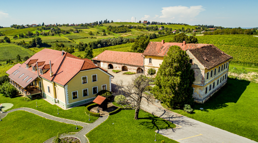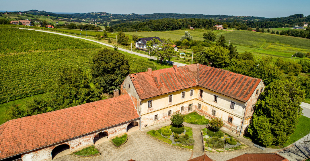 Located in the picturesque Međimurje region, the estate includes vineyards, orchards, and wooded areas typical of the area. The manor is a one-story building with two floors, showcasing a late Baroque and Neoclassical architectural style with decorative corners and rows of windows on both the exterior and courtyard sides.