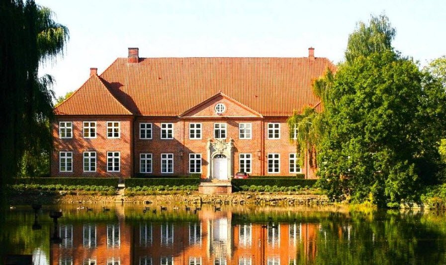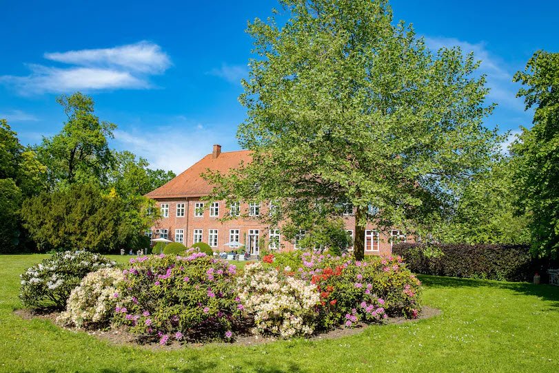 Herrenhaus Borghorst, located in Osdorf, Germany, is a beautifully restored Baroque manor house set within a spacious park featuring romantic duck ponds, old trees, and a herb garden.