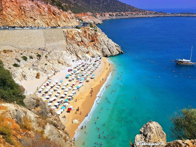 Kaputaş Beach in Bezirgan, Turkey, is a small yet stunning beach located between the towns of Kaş and Kalkan along the Mediterranean coast. It is famous for its clear turquoise waters and a mix of golden sand and small pebbles, creating a comfortable shoreline.