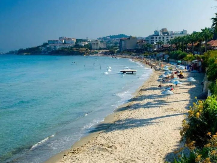 Ladies Beach in Kuşadası, Turkey, is a lovely sandy beach located about two kilometers from the town center, known for its clear blue waters and vibrant promenade filled with cafes, restaurants, and shops.