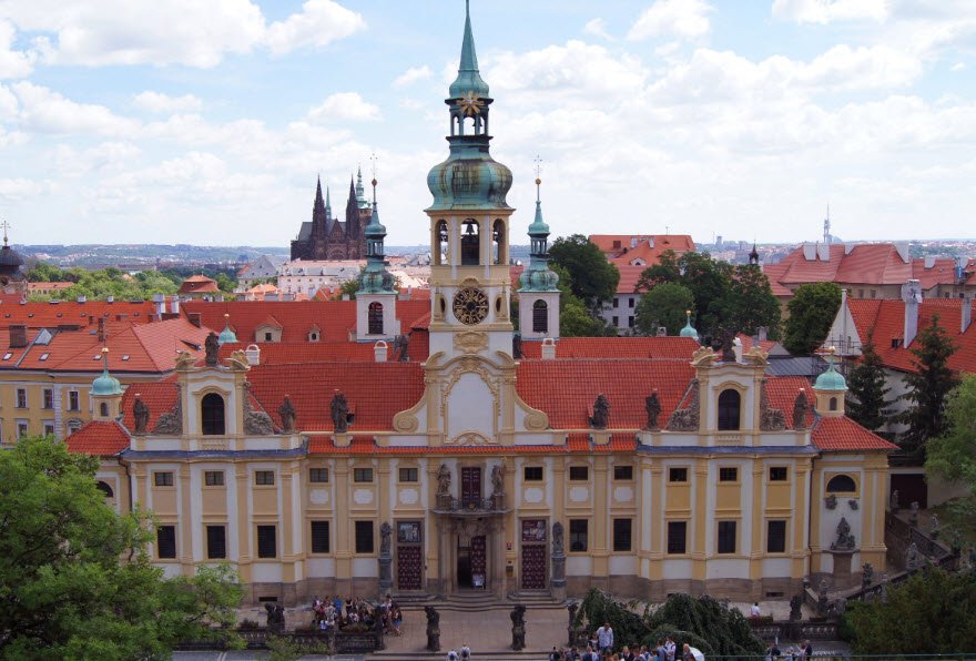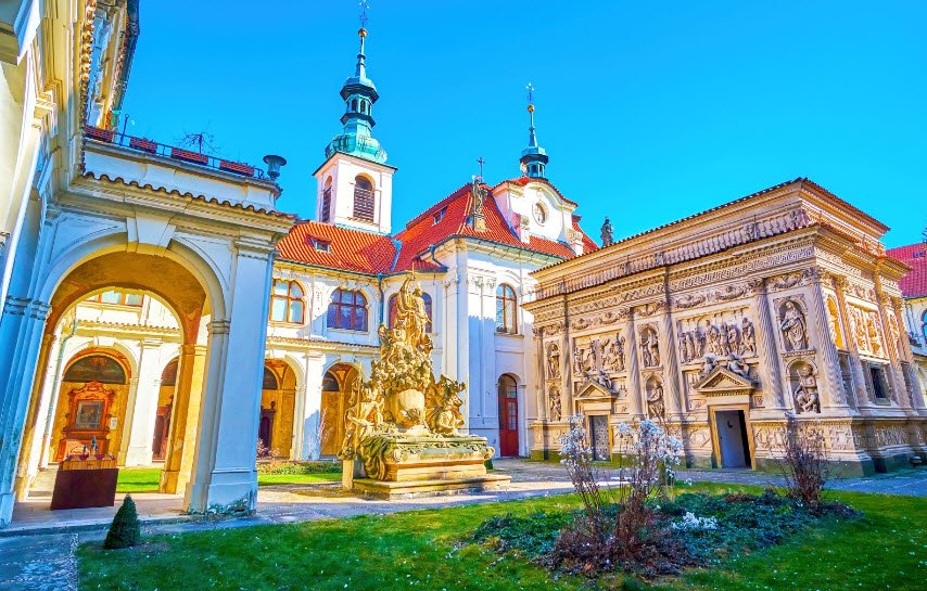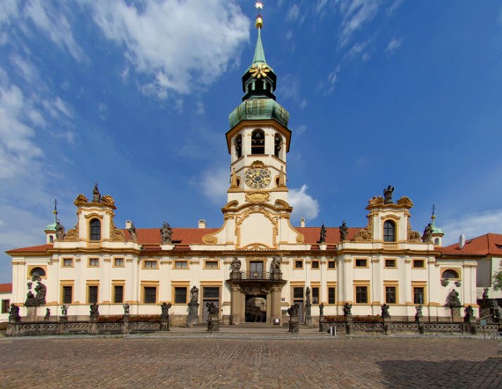 The site includes a richly decorated cloister, the Church of the Nativity of Our Lord which is known for its Rococo interior, and a treasury exhibiting an extensive collection of valuable liturgical objects, including the famous diamond-encrusted monstrance called the "Prague Sun." Loreto is both a place of spiritual significance and an architectural landmark, attracting visitors for its historic art, serene atmosphere, and panoramic views from the bell tower.