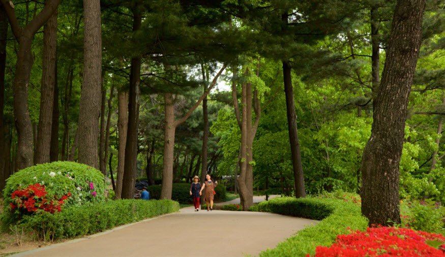 The garden offers paved walking trails, benches, play areas for children, outdoor exercise equipment, and scenic spots for relaxation. Visitors can enjoy seasonal blooms like cherry blossoms in spring and vibrant foliage in autumn. Located on the southern slopes of Mt. Namsan, it connects to other parts of Namsan Park and provides access to the iconic N Seoul Tower. It is easily accessible by public transport and offers a peaceful retreat from the bustling city. Admission to the garden is free.