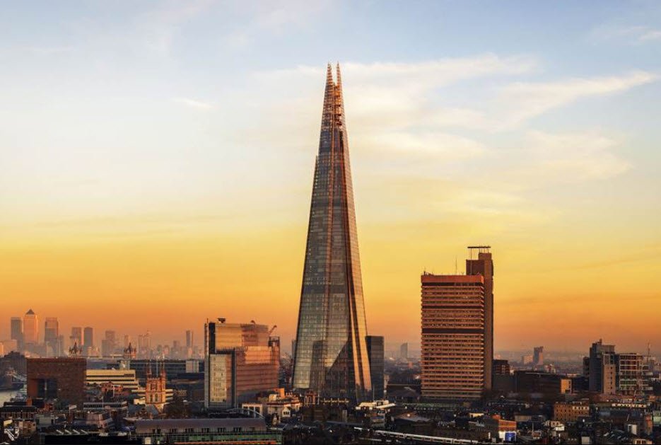 The building is shaped like a glass pyramid, which is why it is called The Shard—it looks like a shard of glass pointing into the sky. Its shiny, sloped glass walls reflect light and change color depending on the weather and time of day, making it a striking part of London’s skyline.