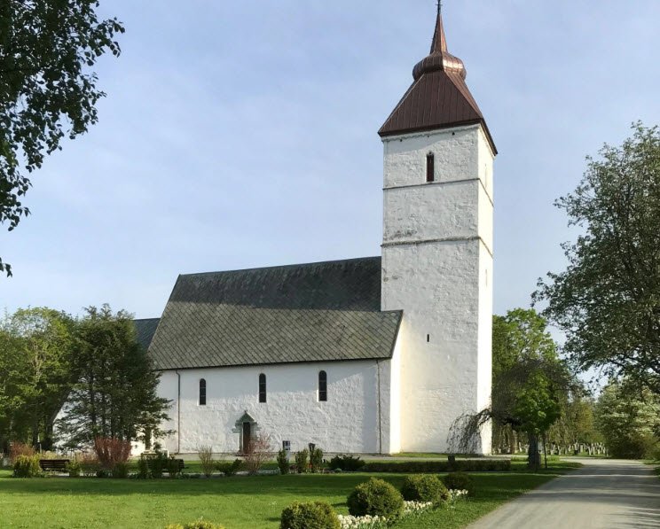 The white stone long church, with a 45-meter tower raised in the 13th century, seats about 370, features medieval carvings of gods and devils on walls, round-arched windows, and later Gothic elements like cloverleaf windows.