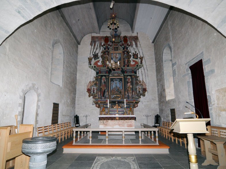 Its standout feature is Norway's oldest preserved wooden roof from 1143 over the chancel, with nave roofing added in 1149 and 1161, spanning over 11 meters and inspiring restorations at sites like Nidaros Cathedral.