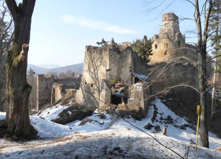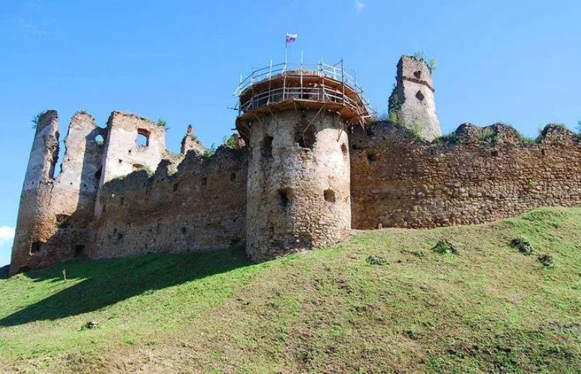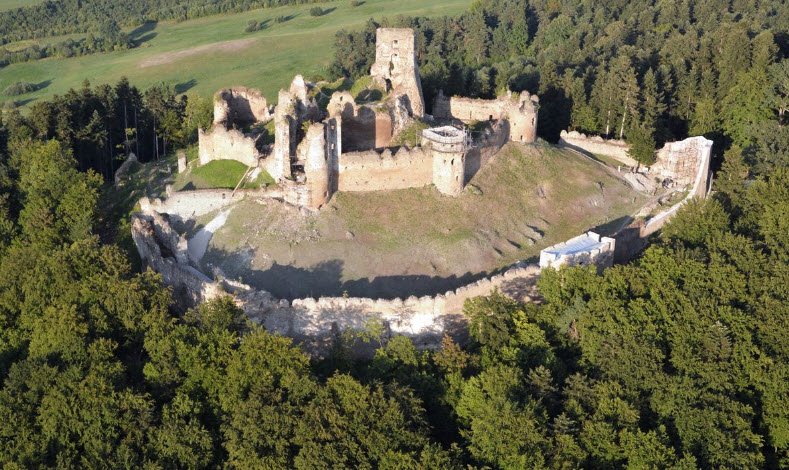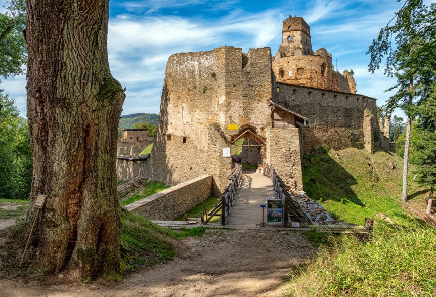 Zborov Castle, known as Makovica, crowns a prominent hill above the village of Zborov in Slovakia's Bardejov District, built in the early 14th century as a royal Hungarian border fortress guarding trade routes through the Carpathians along the Kamenec River valley. Its Gothic core featured a walled courtyard, polygonal tower, palace, and chapel, expanded in the 15th-16th centuries by noble families like the Cudars, Rozgonyis, and Serédys with outer wards, cannon bastions, gatehouses, drawbridges, and Renaissance residences amid three defensive circuits. Though it changed hands repeatedly until the Rákoczi era, the substantial ruins—including walls, towers, cellars, and economic buildings—remain a popular hiking site with preserved access paths today.