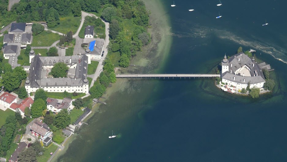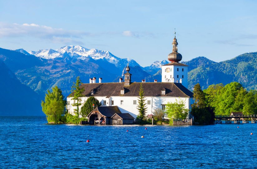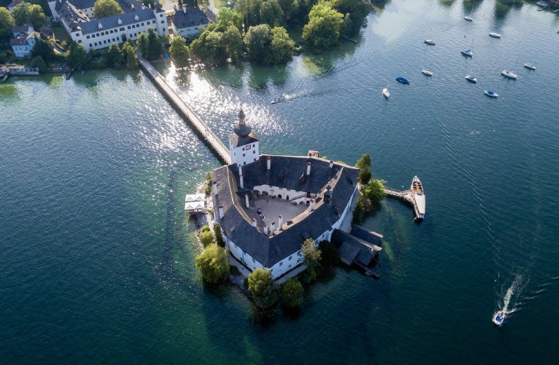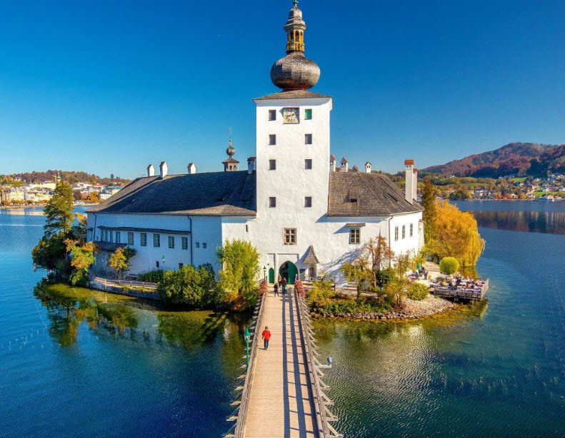 Schloss Ort is connected to the mainland by a picturesque wooden bridge and offers stunning views of the lake and the Alps. Today, it is open to visitors year-round, housing a small museum and hosting cultural events. The castle gained wider fame as the filming location for the television series "Schlosshotel Orth," making it a popular tourist attraction.