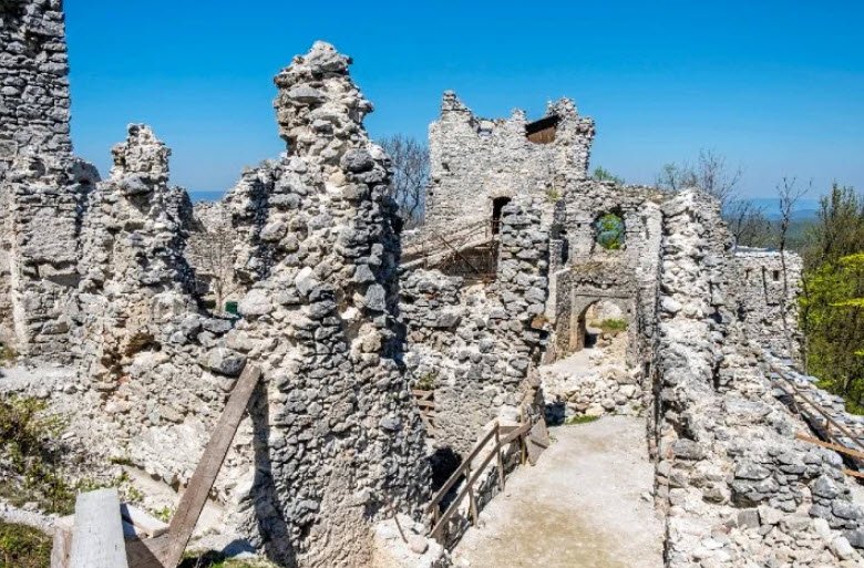 Besieged and heavily damaged by imperial forces in 1710 during the Rákóczi uprising's suppression, it fell into ruin by the early 19th century, leaving Gothic-Renaissance remnants like a 13th-century gatehouse, corner tower, main tower walls, and a massive southern bastion as a hiking destination today.